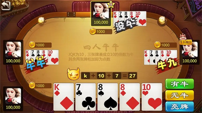 2.玩家在组好牌后进行比牌时,如果双方都出现有牛的情况,那么此时就要比哪个牛大,通过剩余的两张牌再来进一步进行计算,将两张牌的点数相加如果少于10的话,被称为牛几,比如当前两张牌点数相加为8,就称之为牛8,如果说加起来的点数大于10的话,则取个位数的点数,比如加起来的点数为12,就以各位的2为准,称为牛二。